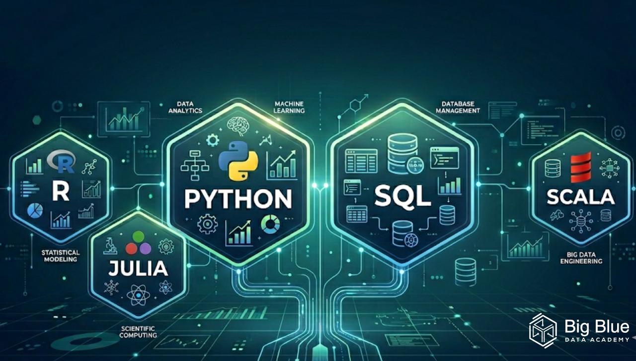 At Big Blue Data Academy, our educational strategy centers entirely on this industry reality. We deliberately focus our curriculum exclusively on teaching Python and SQL. By eliminating the additional time requirement of studying secondary languages like R, Julia, or Scala, we ensure our students achieve a maximum level of technical proficiency in the exact software tools that employers demand most frequently.